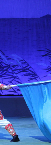Man-wah highlighted that while these are the defining elements of xiqu and Cantonese Opera, there is room for innovation, such as adapting certain techniques to the specific plot and character, and experimenting with the stage technologies. For example, in the iconic scene of the Blue Lion battling the heavy seas on the way to rescue the missing villagers, Man-wah utilised the traditional technique of water sleeves in a new way. Water sleeves technique is typically used by female characters to represent emotional struggles and conflicted states of mind. To suit the Blue Lion, she gave it a masculine twist by incorporating other xiqu movement techniques to depict the Blue Lion engulfed in turbulent waters, represented by the 13-foot long water sleeves. In another scene, stage lighting was utilised to create the ominous atmosphere of the Red Dragon’s den. This projection and just a few props were all that was needed to convey the message.